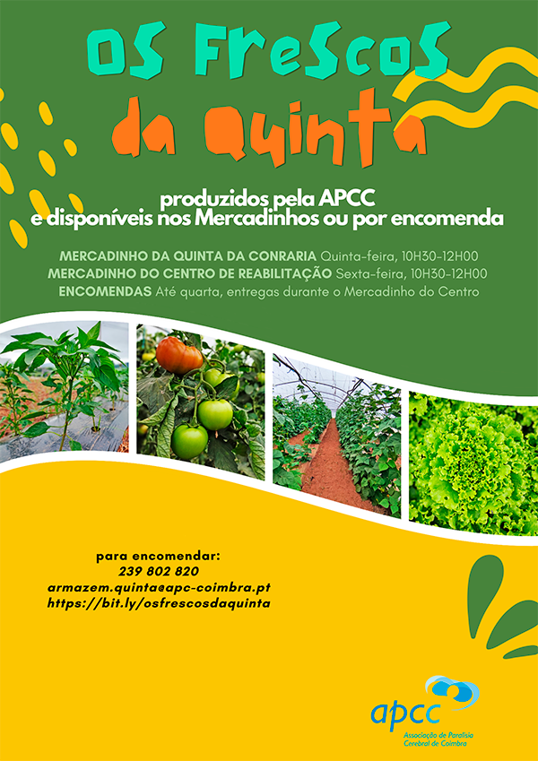 As encomendas d’Os Frescos da Quinta podem ser feitas entre segunda e quarta-feira (através do telefone 239 802 820, do mail armazem.quinta@apc-coimbra.pt ou do formulário disponível em https://bit.ly/osfrescosdaquinta), sendo agora entregues durante o Mercadinho do Centro de Reabilitação. Tal como já acontecia antes, todas as segundas poderá consultar na página de Facebook da APCC os produtos disponíveis para essa semana.